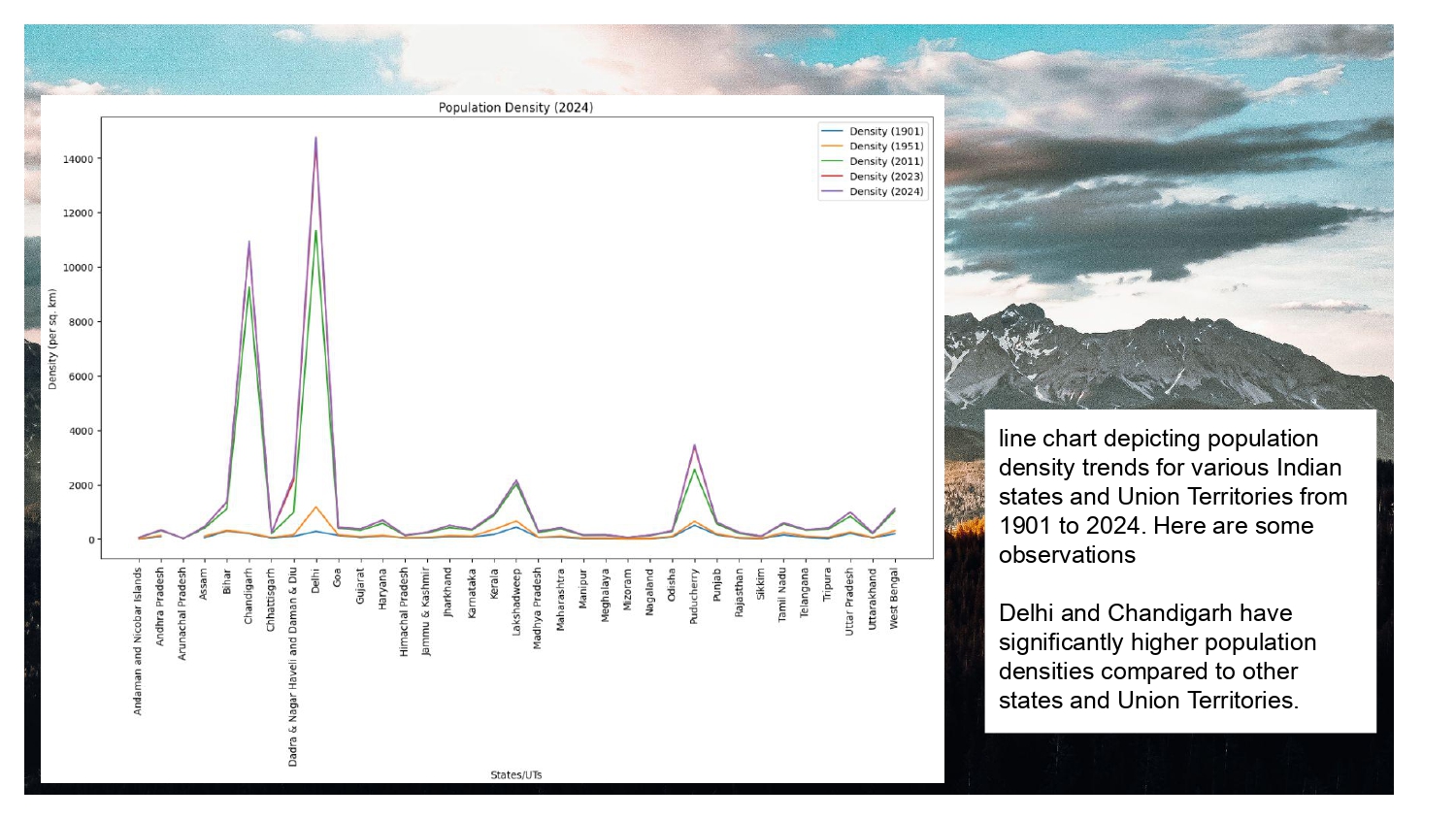 - Line chart depicting population density trends for various Indian states and Union Territories from 1901 to 2024.