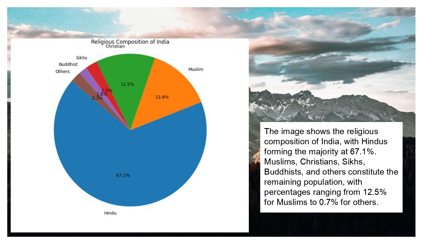 - Religious composition of India shows Hindus forming the majority at 67.1% of the population.