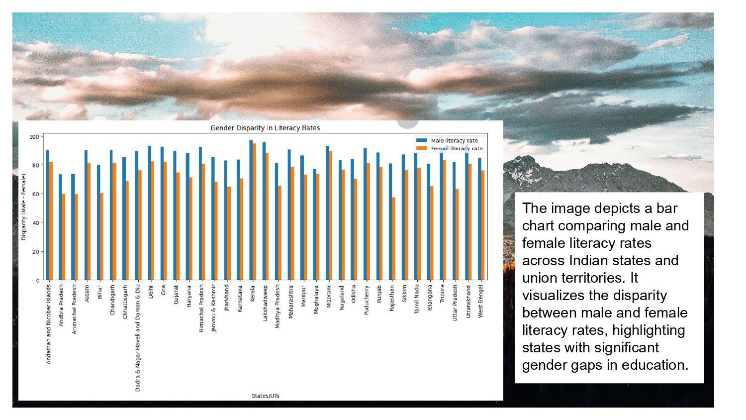 - Bar chart comparing male and female literacy rates highlighting states with significant gender gaps in education.