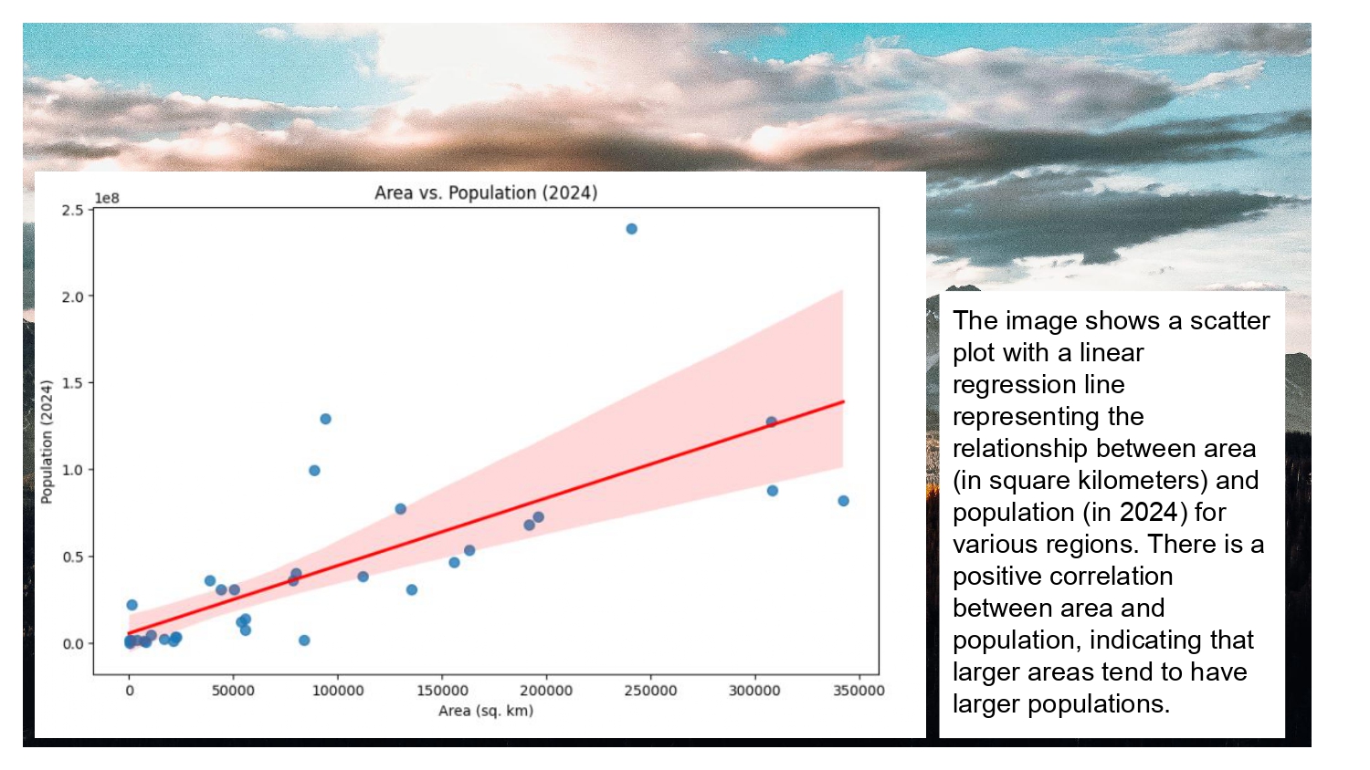 - Scatter plot with linear regression line showing relationship between area and population for various regions.