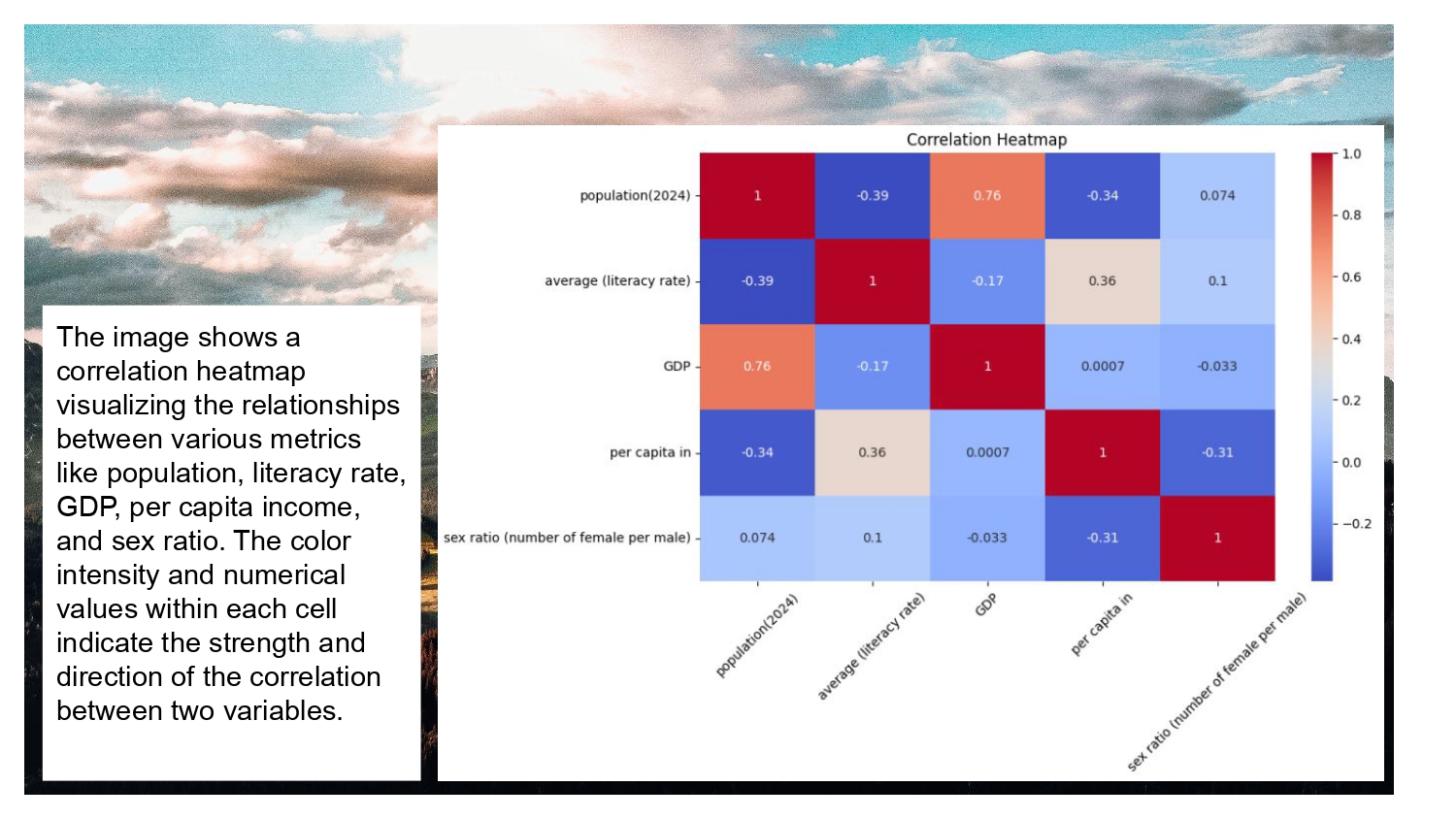 - Correlation heatmap visualizing relationships between population, literacy rate, GDP, per capita income, and sex ratio.
